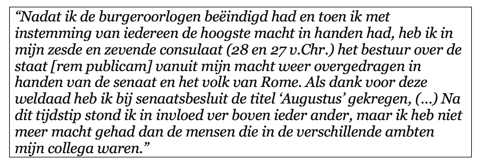 Augustus zoals we Octavianus vanaf nu gaan noemen, slaagde erin om de politieke macht te kunnen behouden. Daarnaast probeert hij verschillende andere bevoegdheden naar zich toe te trekken. Gebruik de onderstaande bron om de bijhorende vragen te beantwoorden. De onderstaande bron zou je een antwoord moeten geven op welke machten Augustus naar zich toe kon trekken.